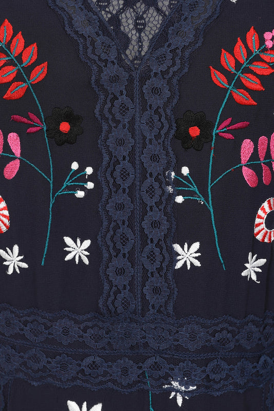 Navy Christmas Embroidered Maxi Dress with Lace Panels