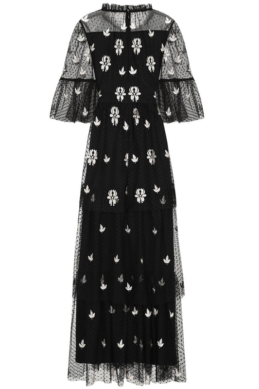 Black Leaf Embroidered Tiered Maxi Dress